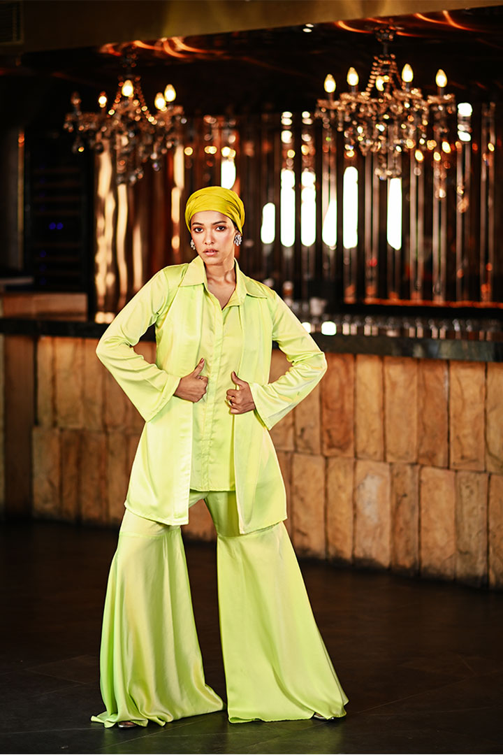 A luxurious Neon Yellow ensemble , hand-embroidered with delicate pearls that catch the light with...