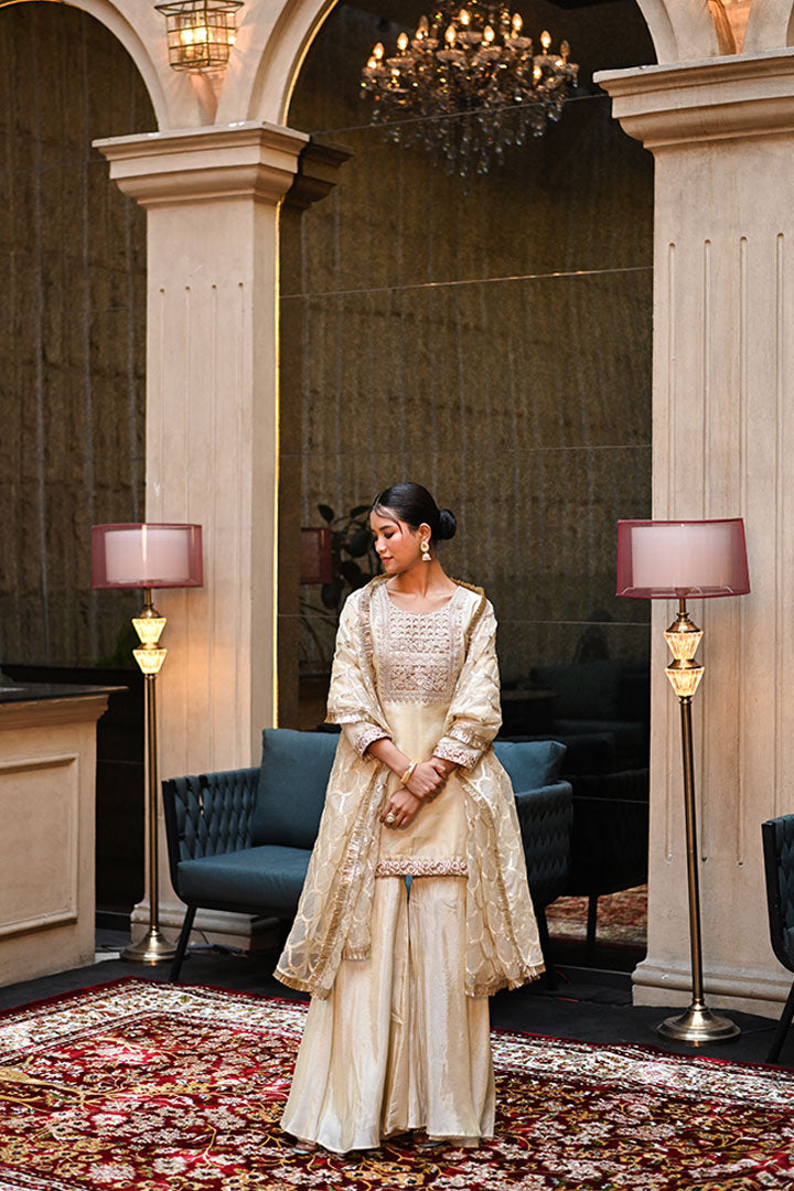 A three-piece Indian suit crafted from luxurious champagne-colored silk tissue fabric, exuding an air of...