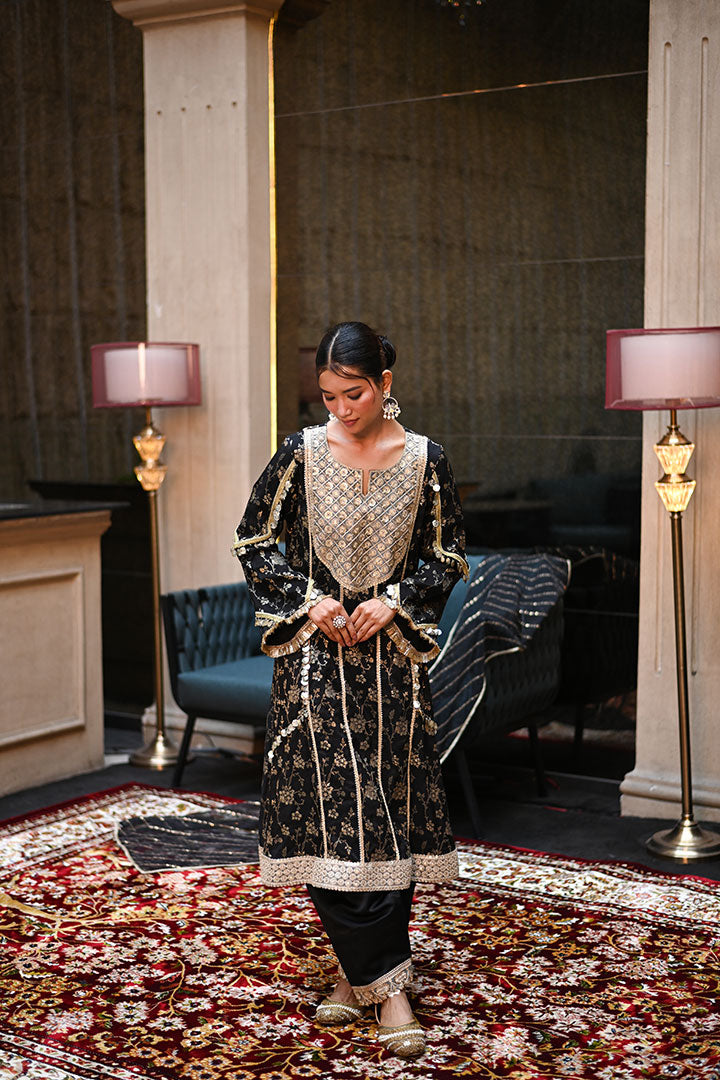 Crafted from luxurious silk Chanderi fabric, this three-piece suit set exudes opulence and sophistication with...