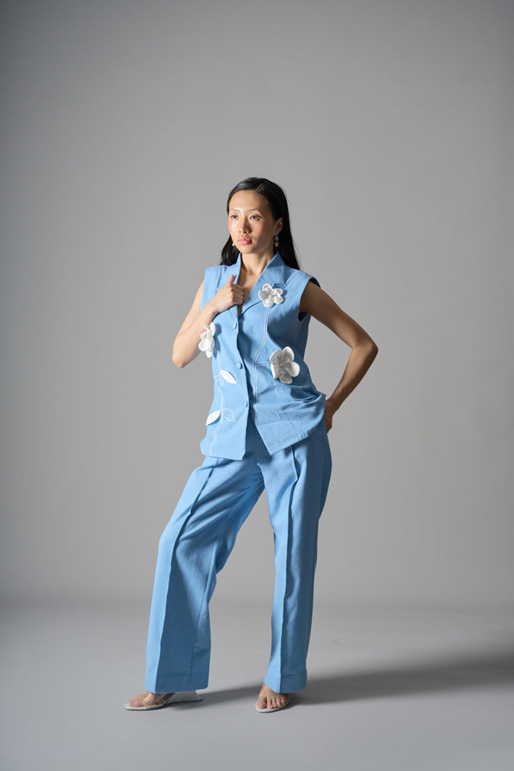 A coordinated set featuring an ivory blazer with distinctive cape sleeves and matching baggy pants...
