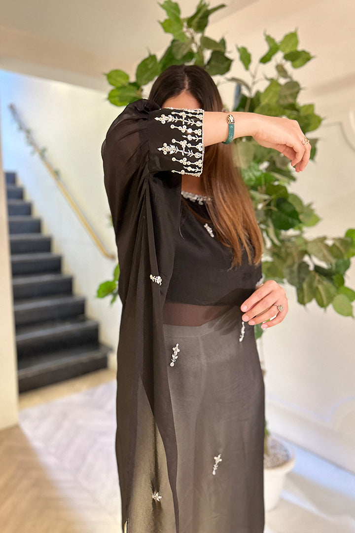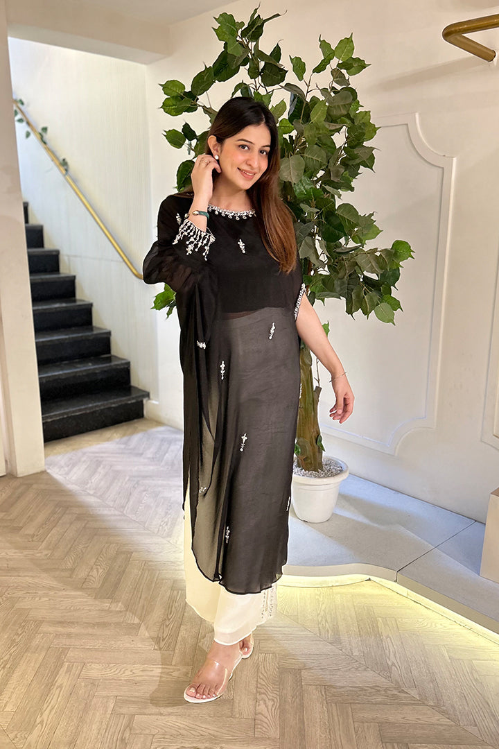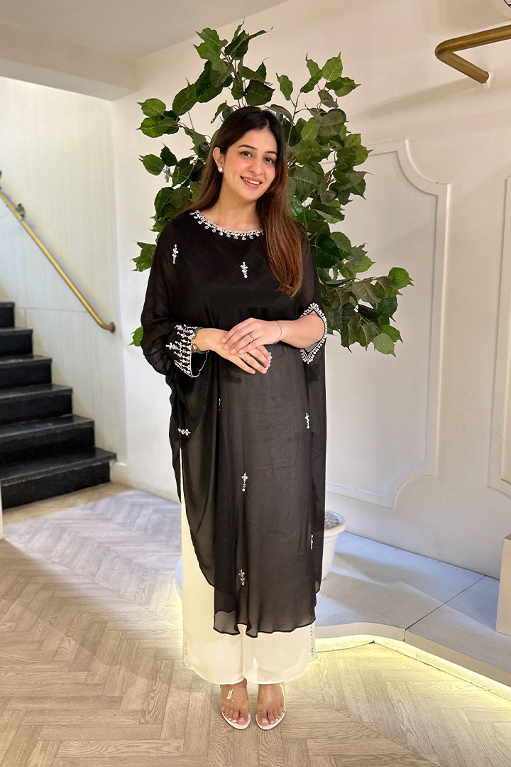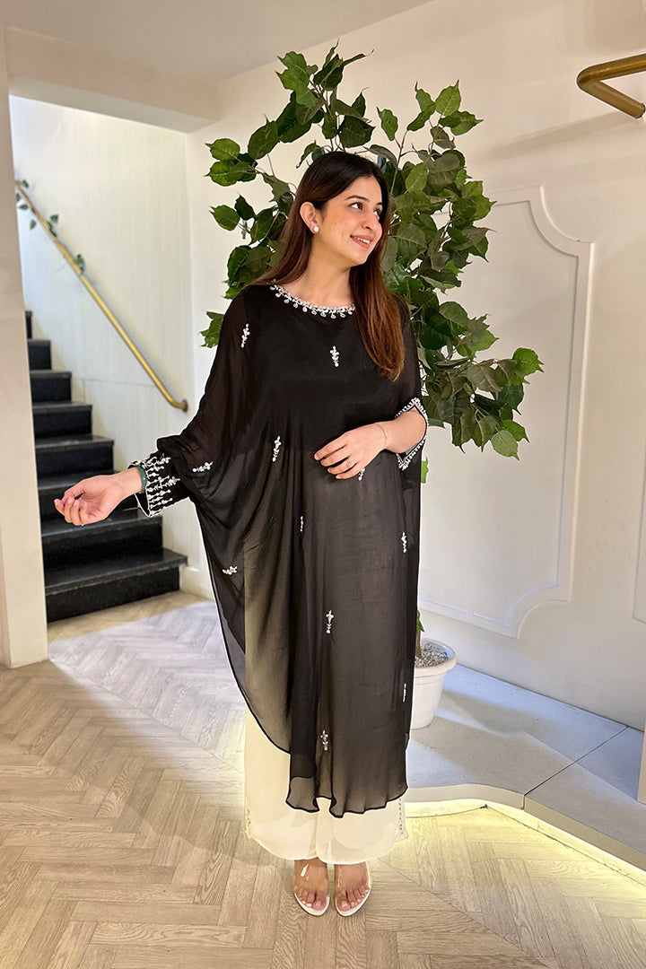 Black Embroidered Cape Kurta With Bustier and Ivory Pants.