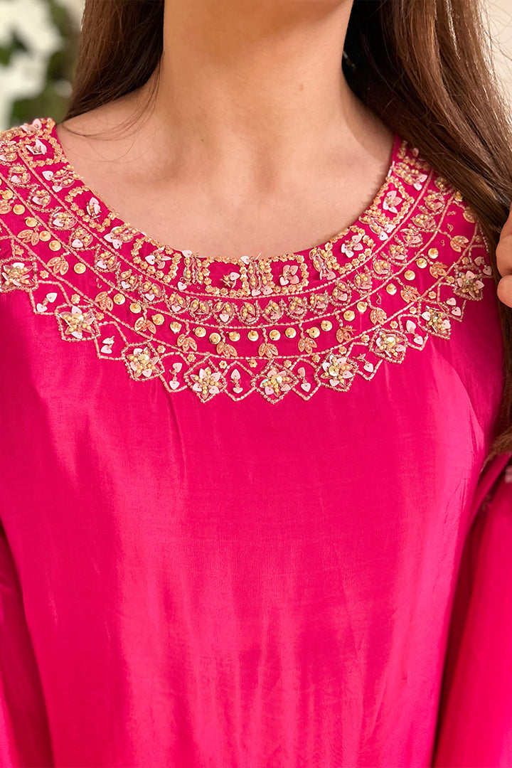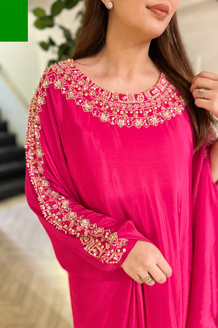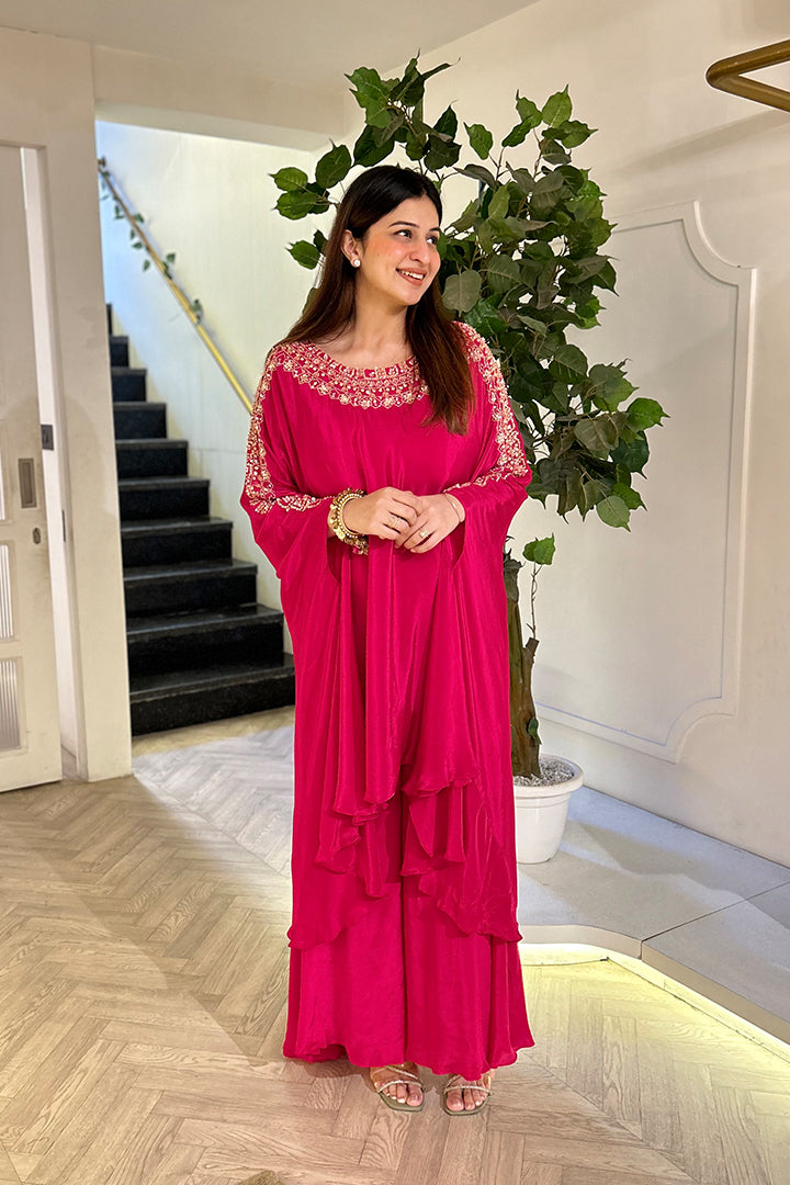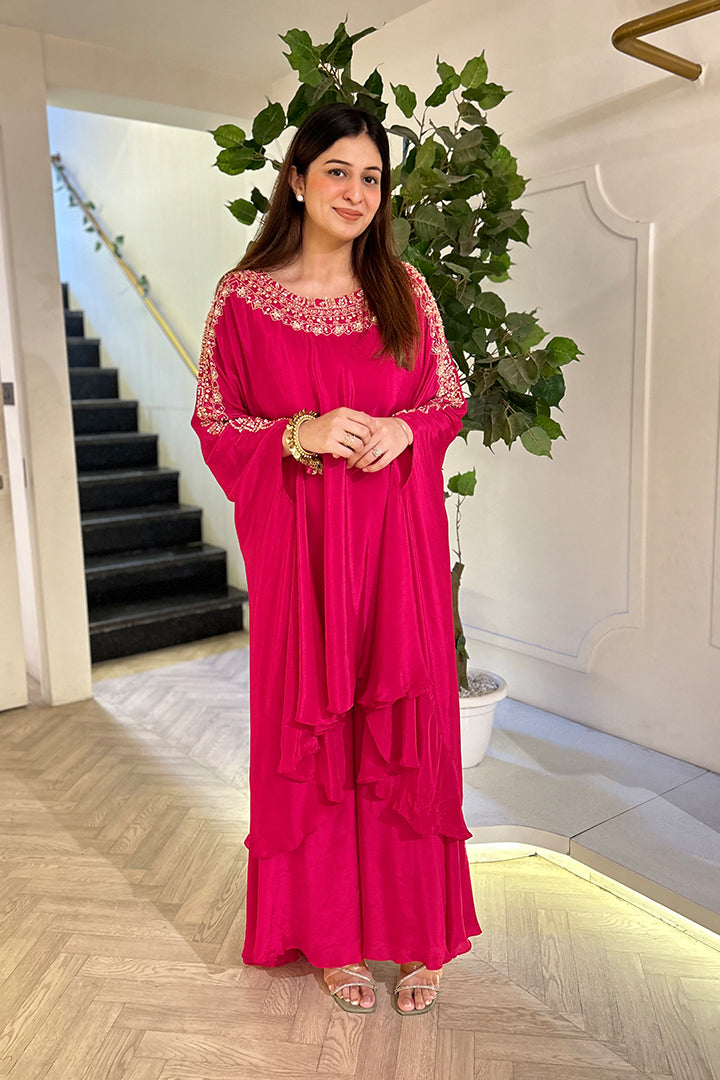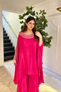 Fuschia Pink 3 Piece Ensemble With a Kaftan Cape, Bustier and Wide Pants.