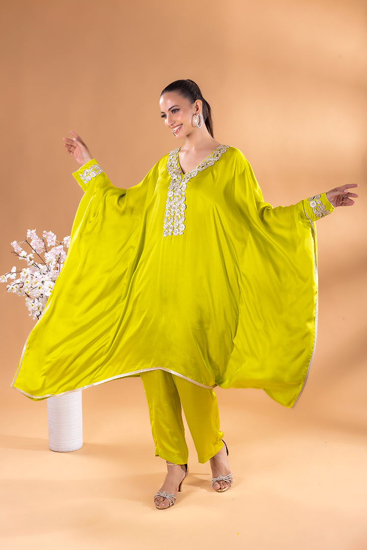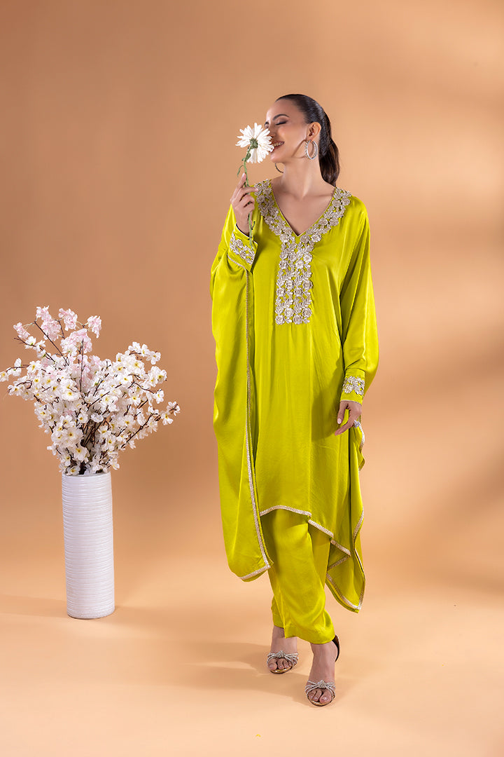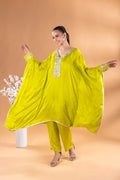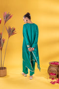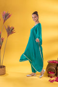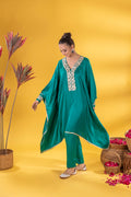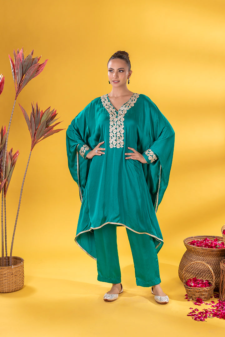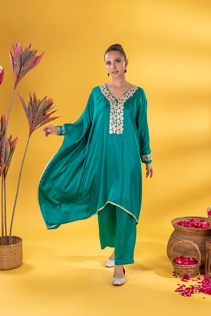 This emerald green kaftan Co-ord exudes regal elegance, its neckline adorned with gold and silver threadword, dazzles with every glance. The free falling fabric whispers grace,making it ideal for indoor gatherings. Vibrant and timeless, this Mia Emerald Kaftan Co-ord harmonizes beautifully with