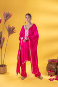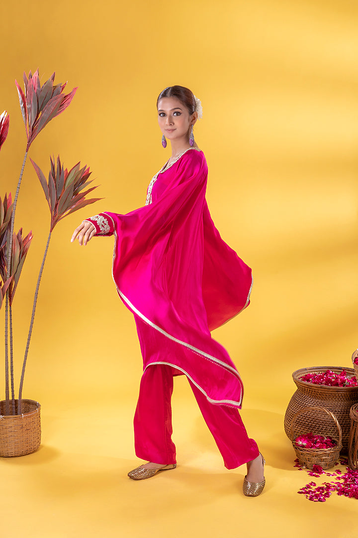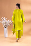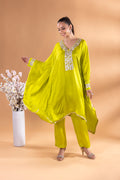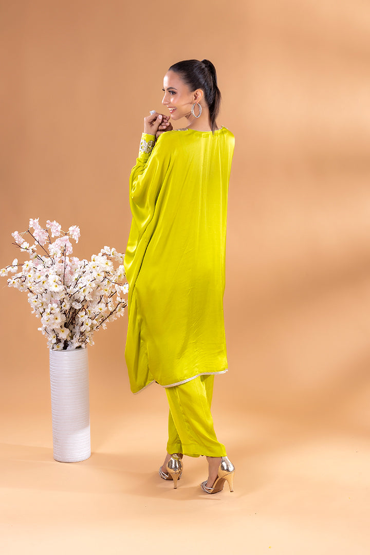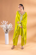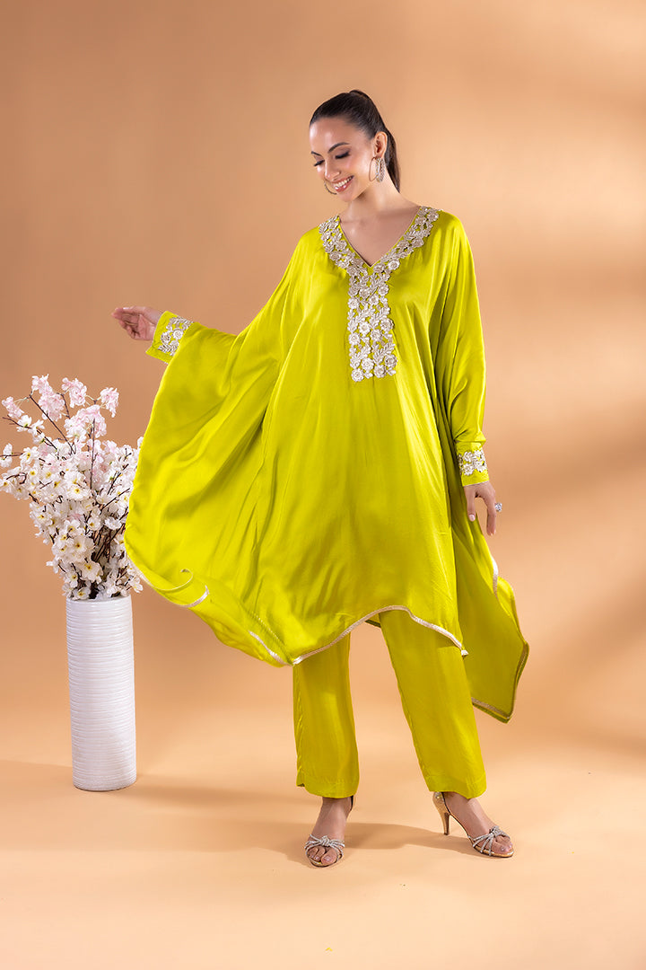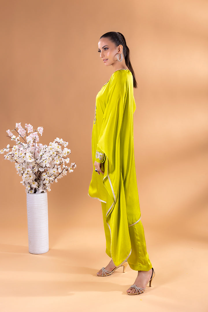 This emerald green kaftan Co-ord exudes regal elegance, its neckline adorned with gold and silver threadword, dazzles with every glance. The free falling fabric whispers grace,making it ideal for indoor gatherings. Vibrant and timeless, this Mia Emerald Kaftan Co-ord harmonizes beautifully with