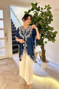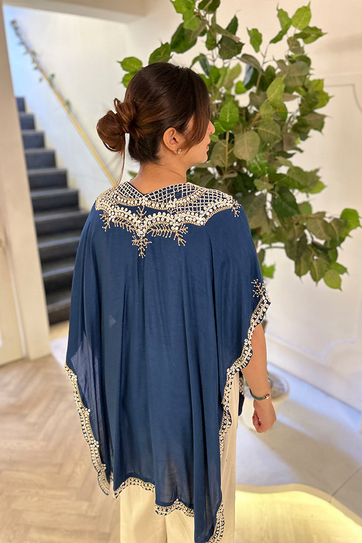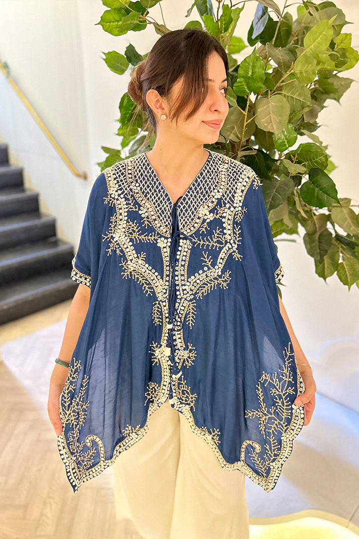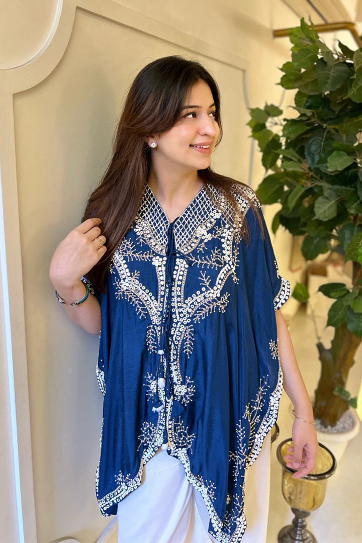 Purple embroidered asymmetric top with Ivory dhoti pants and tassel details.