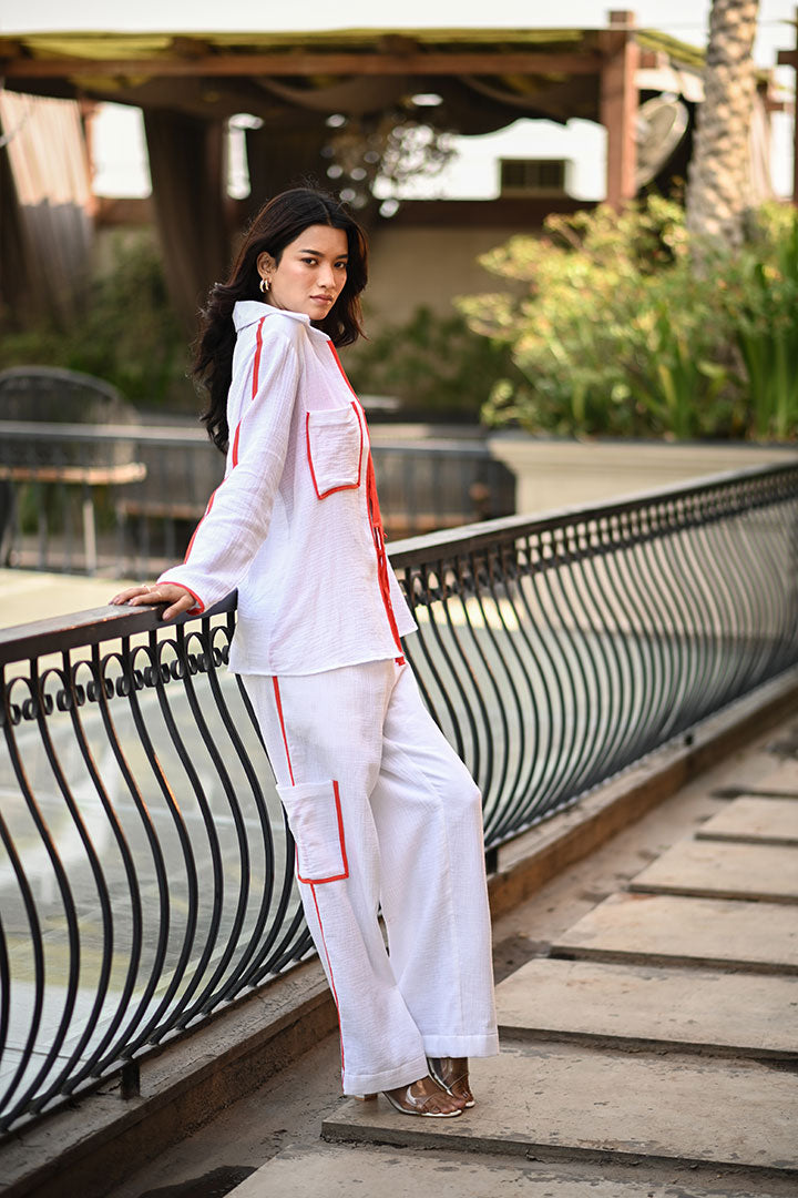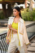 A perfect summer outfit for your vacation, brunches or an evening out with your friends!. It's a beautiful tie-up top with Cargo pants & Bustier in Subtle pastel shade with a pop of neon.