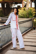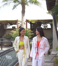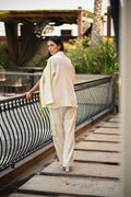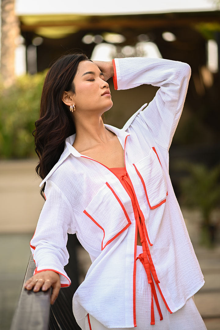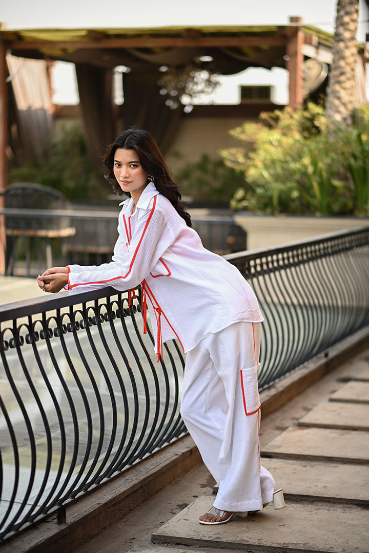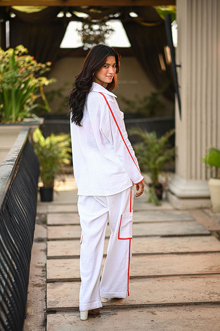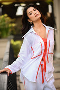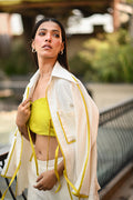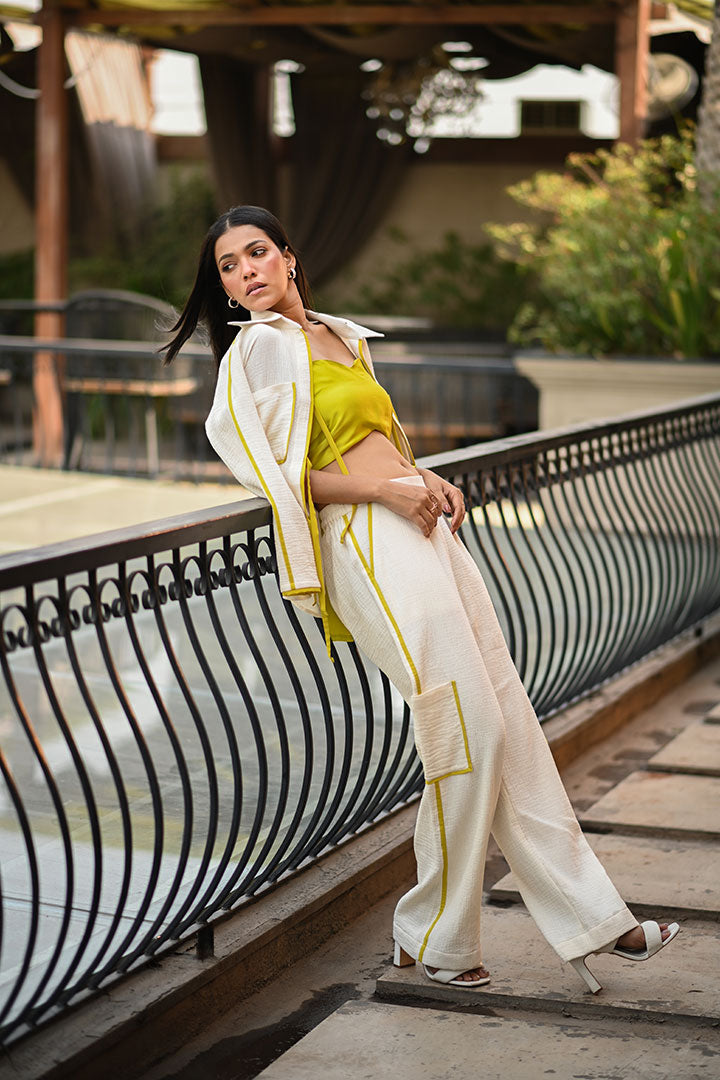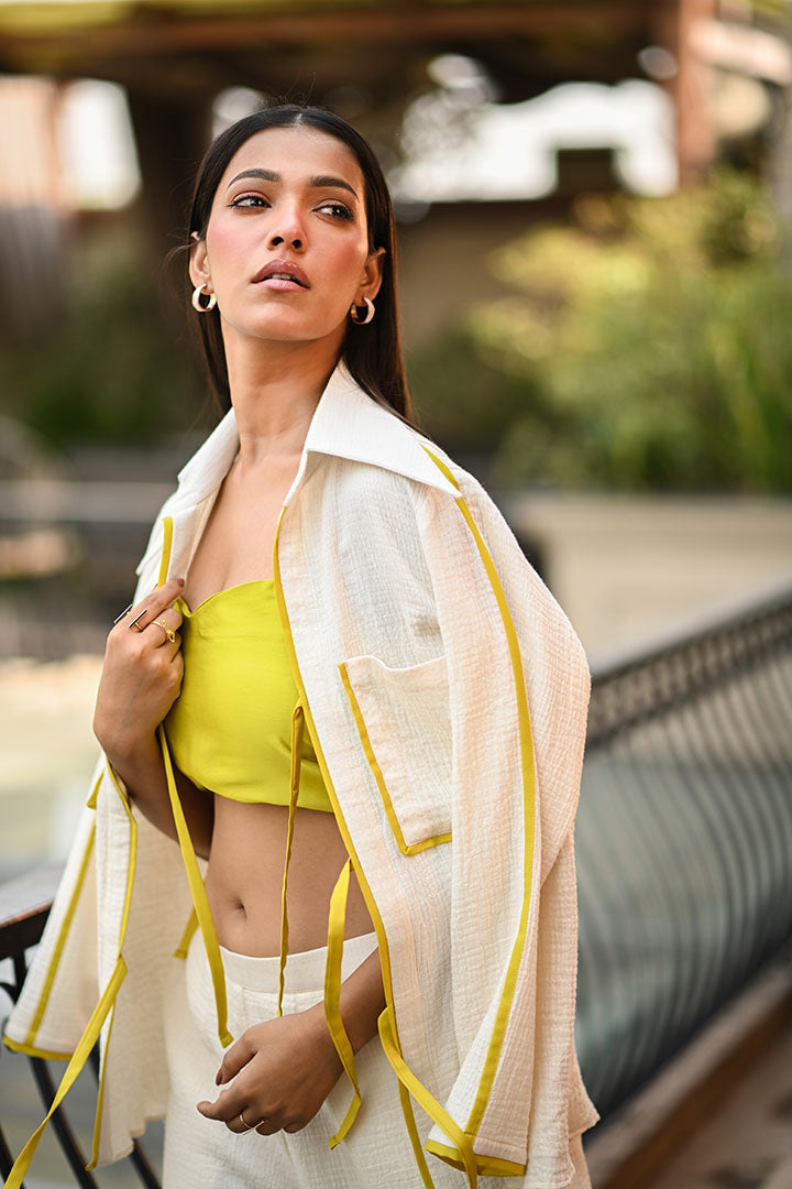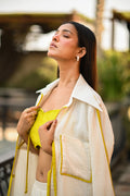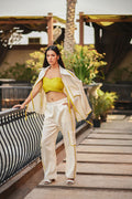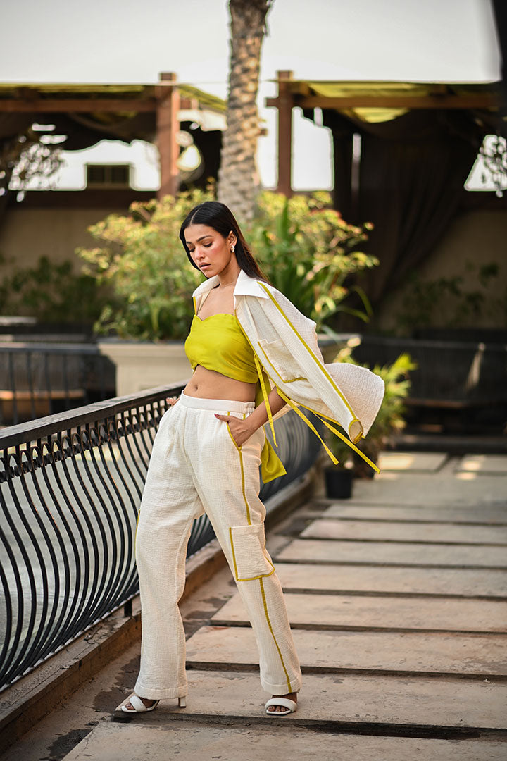 A perfect summer outfit for your vacation, brunches or an evening out with your friends!. It's a beautiful tie-up top with Cargo pants & Bustier in Subtle pastel shade with a pop of neon.