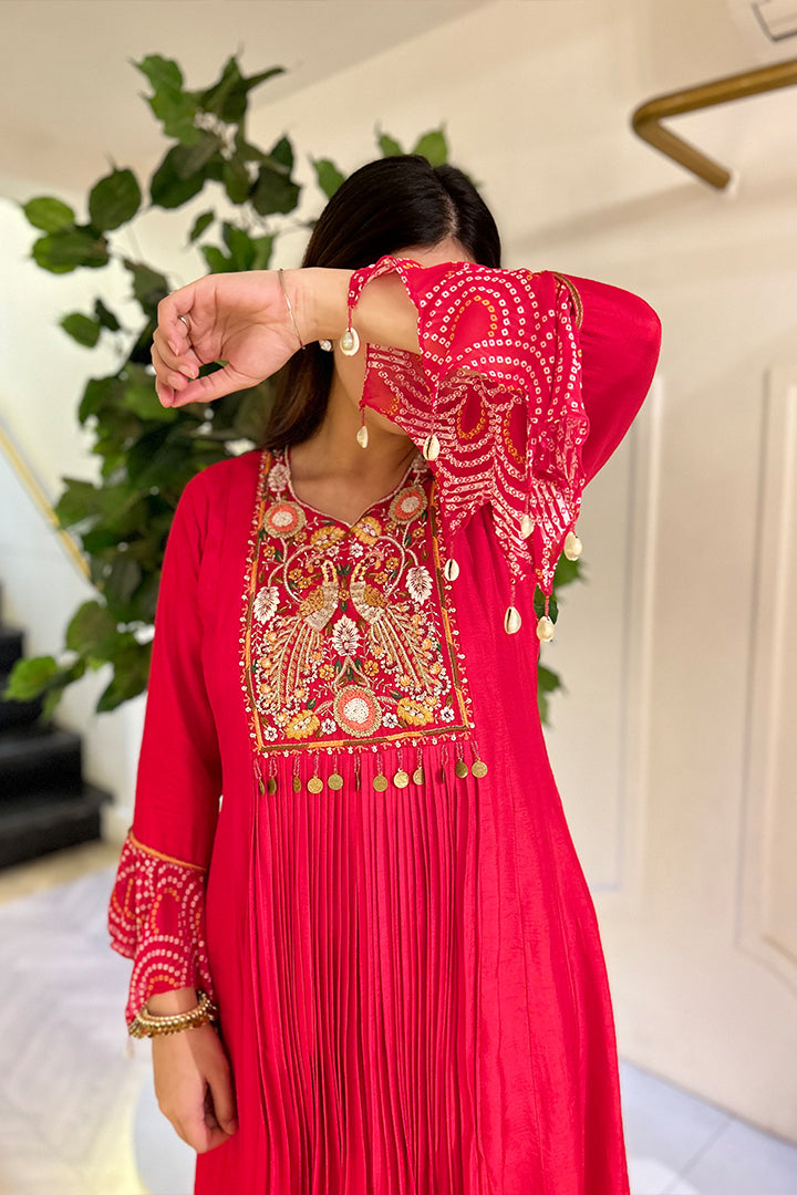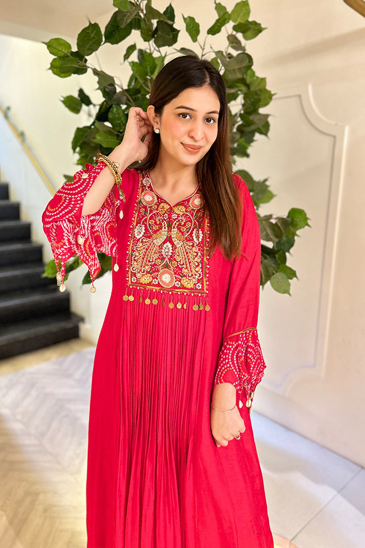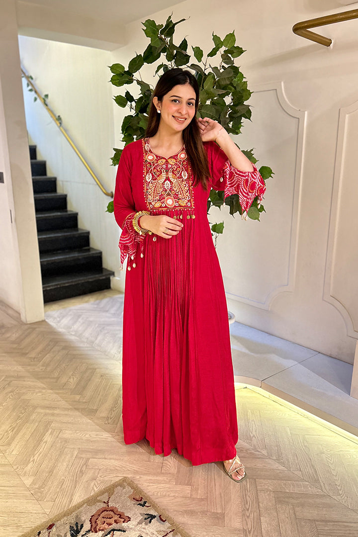 Deep Red Pleted Floor-Length Gown With Detailed Yoke Embroidery and Tassel.